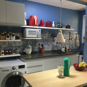 Nesta cozinha a cliente pediu para usamos os ladrilhos portugueses, trazendo o azul e amarelo para o ambiente, para alegrar e colorir mais o ambiente, além de integrar melhor a cozinha com a sala, transformando a bancada em uma mesa de jantar.